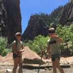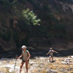 De wandeling eindigt bij de Narrows en die moeten wij natuurlijk ook doen, althans een stukje. De gorge is 16 Miles lang, wij doen er maar 1. Je wandelt met een stok door het water. Het is zo tof om te doen, we kunnen gewoon niet stoppen. Boris en Isabella genieten volop. In het koele water, in de schaduw, afgeleid door watervallen en hanging Gardens lopen we steeds verder. Totdat het te diep wordt voor Boris. We gaan terug om langs ‘t water nog wat te lunchen en onze schoenen te legen.